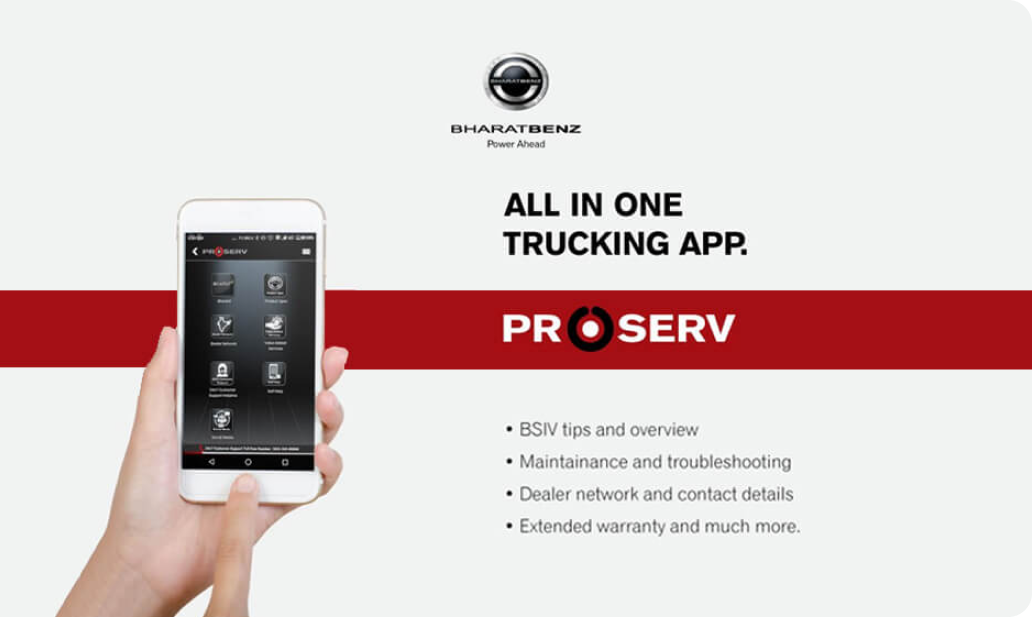 We Promise An Exciting Ownership Experience Nobody knows your BharatBenz than we do, and No one is better equipped to service them than we are. Did you know that servicing your Truck cost less than servicing your car? Periodic services are an important service recommended by manufacturers at regular intervals to optimize the performance, reliability, safety, durability and resale value of your Truck or Bus. ProServ from BharatBenz is designed to suit the specific needs of your business, it's speedy, effective, reliable proactive service ensuring that you only need to manage your business & concentrate on expanding it, leaving everything else about the truck to us. Daimler Certified professionals are here to offer all round scheduled services to complex aggregate repairs with ease.